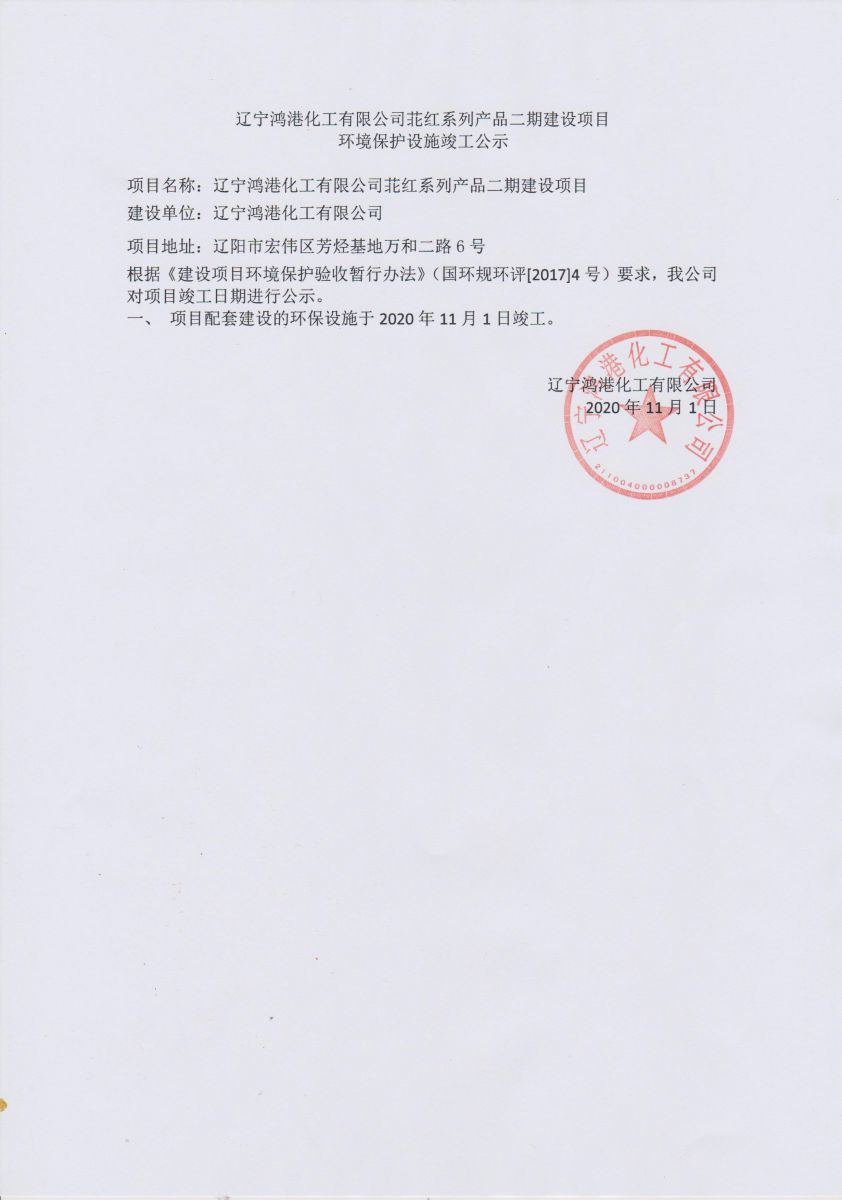 遼寧鴻港化工有限公司苝紅系列產品二期建設項目 環境保護設施竣工公示