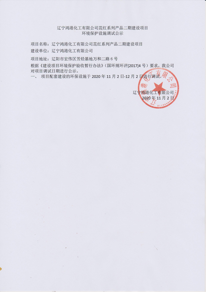 遼寧鴻港化工有限公司苝紅系列產品二期建設項目 環境保護設施調試公示